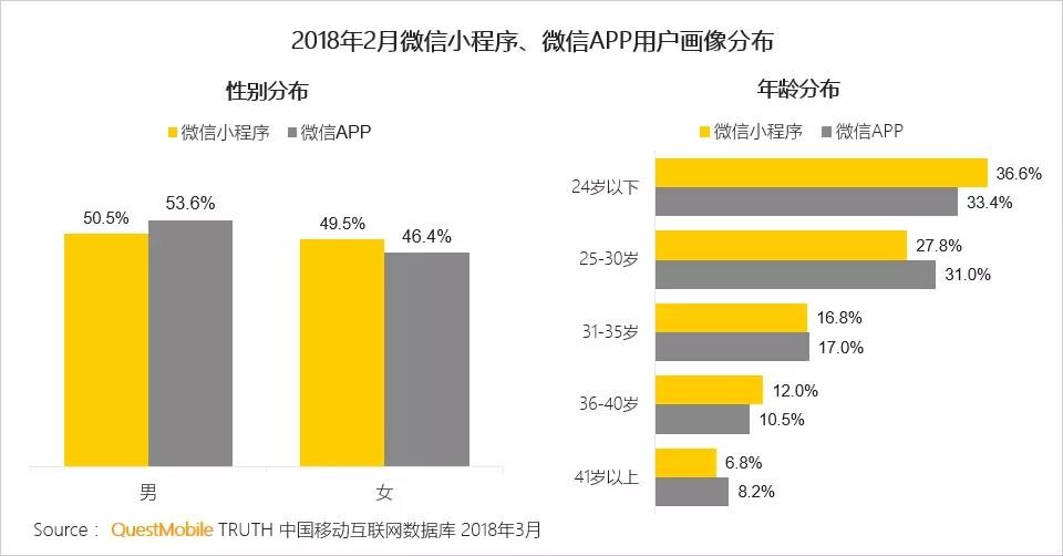從報(bào)告中顯示,微信小程序使用占較多的是年輕人群,除此之外,微信小程序用戶和微信APP用戶特征的差異并不顯著,相對(duì)而言,女性用戶和24歲以下人群占比略高。從側(cè)面中顯示了微信小程序已經(jīng)占領(lǐng)了大部分年輕群體,但小程序的目標(biāo)并不是單一的人群,而是希望各類(lèi)人群都能夠方便使用小程序。