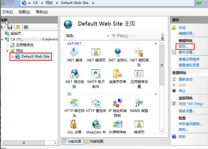 點擊網(wǎng)站下的站點名稱,點擊右則的綁定