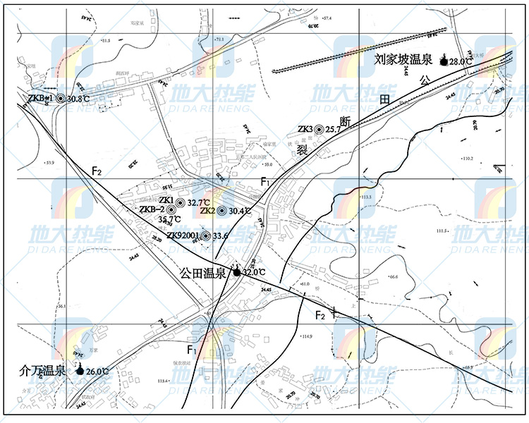 根據(jù)抽水試驗(yàn)實(shí)測(cè)涌水量、水溫結(jié)合鉆孔與區(qū)內(nèi)斷裂構(gòu)造的相對(duì)位置分析,靠近F2則相對(duì)富水,水溫亦升高;且隨著含水層(公田斷裂破碎帶)埋深的增大,揭露的地下水溫也增高;地下水溫度與含水層埋深有關(guān),也和地下水賦水空間與深部熱源溝通程度有關(guān)。