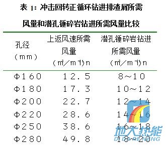 基巖水井通??趶綖棣?60~Φ280mm之間,該口徑硬巖的鉆進效率低,成本高,施工周期長,成為鉆探界亟待解決的難題。20世紀70年代開始,我國已引進潛孔錘技術應用于水井鉆鑿,鉆進效率數倍提高,展示了潛孔錘鉆進的良好前景。但水井工程,孔深大,背壓高,配套使用的空壓機不但風量要求大,風太也高,使鉆進成本大幅度增高。主要矛盾是滿足排渣屑上返風速的要求時,供風量巨大,遠超過了潛孔錘本身工作的需求。計算不同孔徑條件下滿足上返風速15m/s供風量的需求,見表1(Φ89鉆桿為例)。表1數據表明,孔徑越大,為滿足排渣屑要求而消耗的能量越大,經濟性越差。若實施反循環鉆井技術工藝,則排渣屑所需風量大大減小,如表2所示。